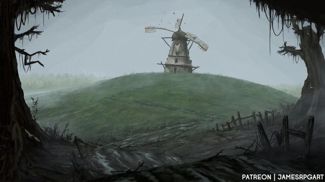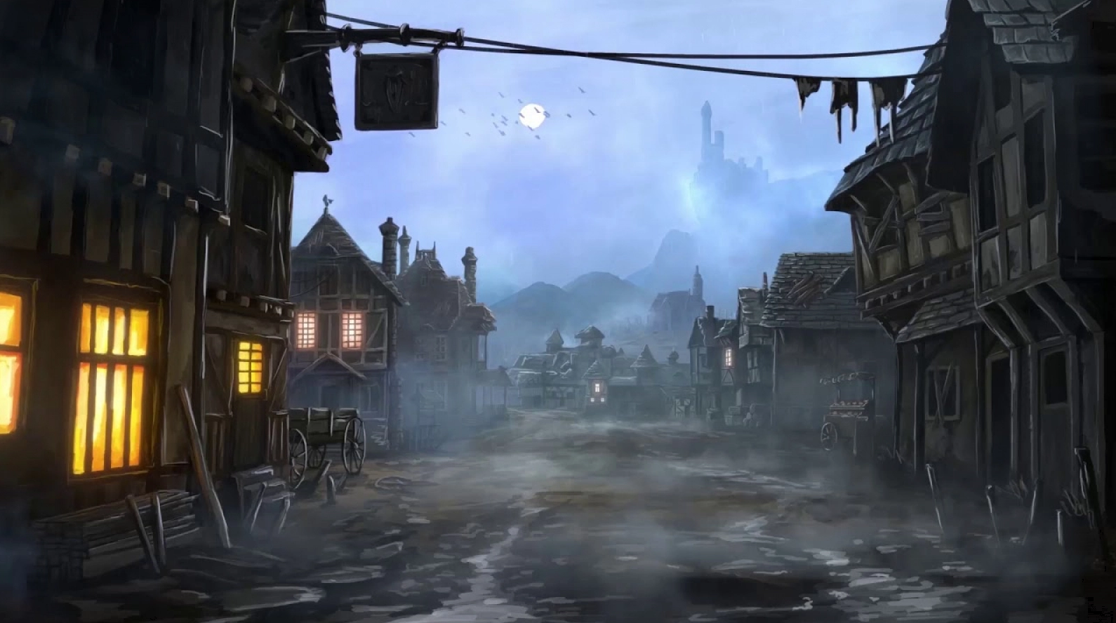 De hautes silhouettes se dressent hors de l’épais brouillard omniprésent. Le sol boueux sous vos pieds laisse place à des pavés humides et glissants. Peu à peu, ces formes sombres deviennent reconnaissables : il s’agit des habitations d’un village. Leurs façades usées semblent vaciller sous le poids du temps. Aucun son ne vient briser le silence, à l’exception de tristes et lointains sanglots dont l’écho résonne dans les rues désertes. Les ruelles tristes du village apparaissent bien vides. S’il n’y avait pas la lueur des occasionnelles lumières vacillantes derrière les rideaux fermés des maisons environnantes, vous pourriez croire à une ville fantôme. Au nord, une vieille église veille sur un cimetière oublié, ultime témoin d’un passé que plus personne n’ose évoquer. Et, à l’horizon, l’ombre d’un immense château pèse sur le village, telle une menace silencieuse.
